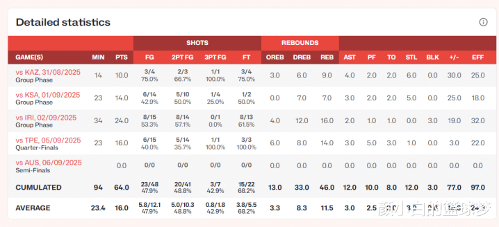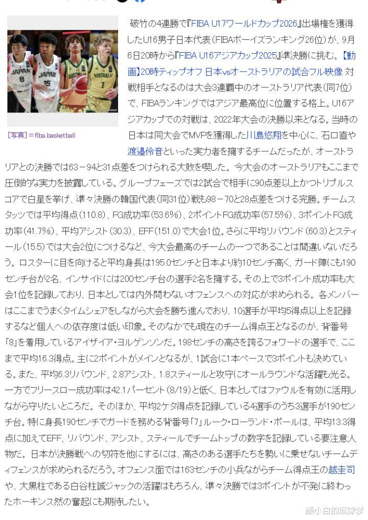 文中写道:上一届U16亚洲杯日本队有MVP川岛悠翔也在决赛中31分惨败澳大利亚,本届大赛澳大利亚的硬实力比上一届还要强,场均110.8分,命中率53.6%,三分命中率41.7%,场均助攻30.3,效率值151都是大赛第一。