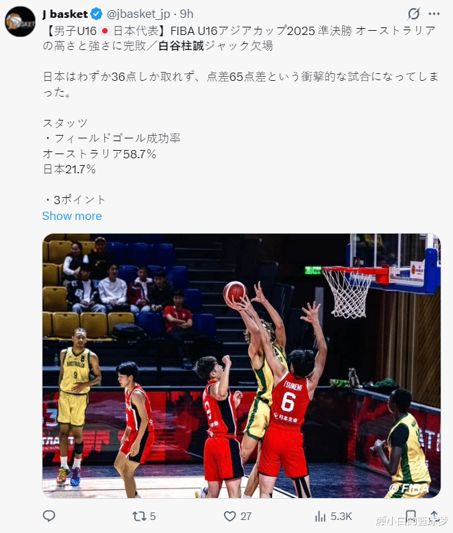 U16男篮亚洲杯半决赛,日本队36-101惨败澳大利亚队,这场比赛澳大利亚狂胜日本65分之多,首节澳大利亚就是31-10直接将比赛收割,日本队毫无招架之力。