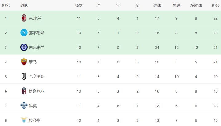 在积分榜上,AC米兰登上了榜首位置。AC米兰总积分达到22分,和那不勒斯积分相同,但在净胜球一样的情况下进球数占优,得以排名第1。不过,AC米兰比那不勒斯多赛一场,分分钟有可能被挤下去。国际米兰以21分排名第3。罗马也是21分,排名第4。尤文图斯19分,排名第5。博洛尼亚和科莫都是18分,排名第6和第7名。