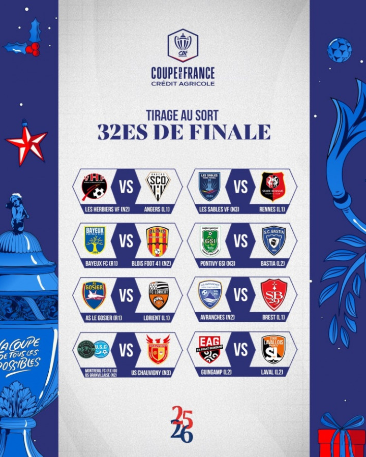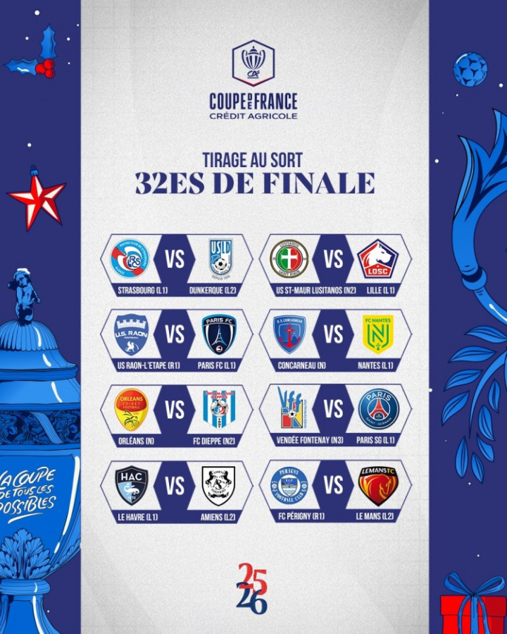 法国杯32强抽签: 斯特拉斯堡VS敦刻尔克 旺代丰特奈VS巴黎