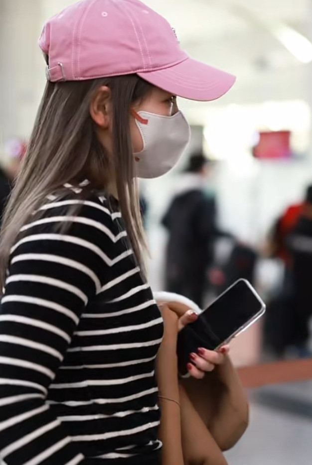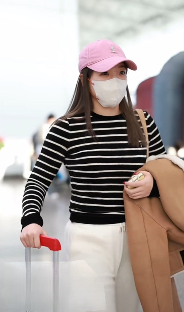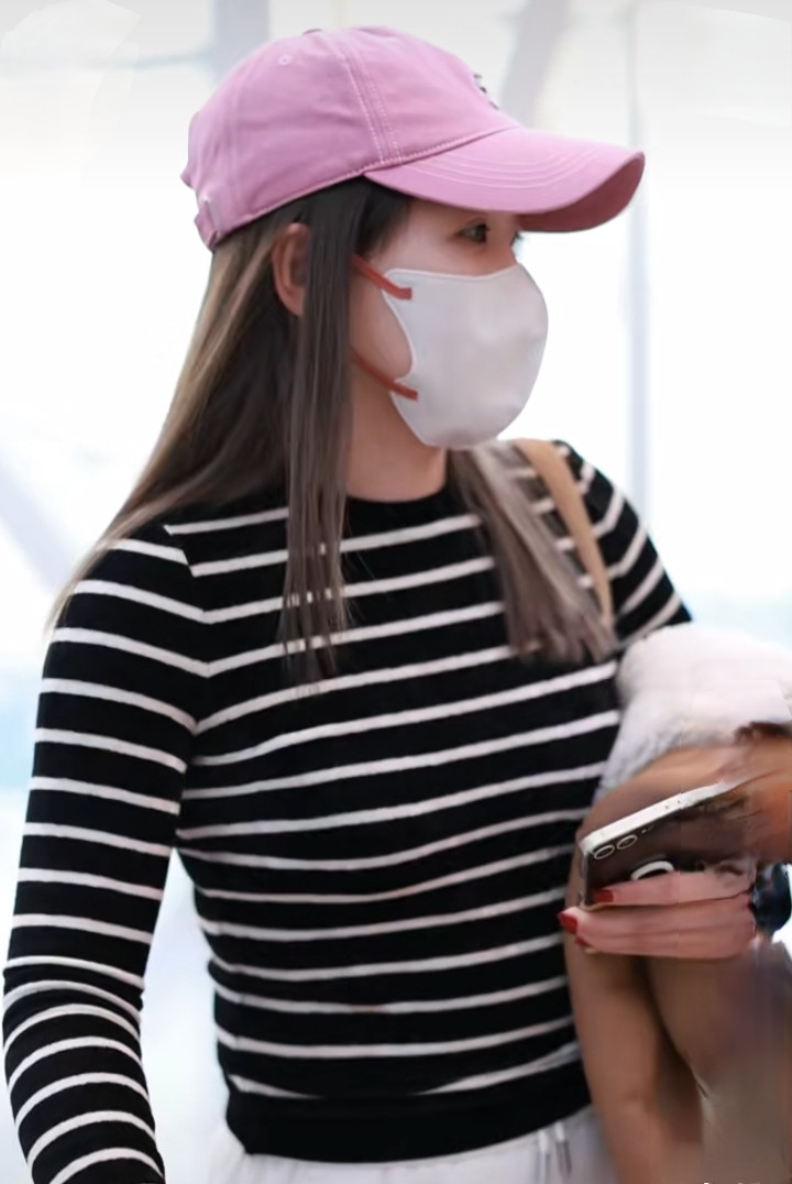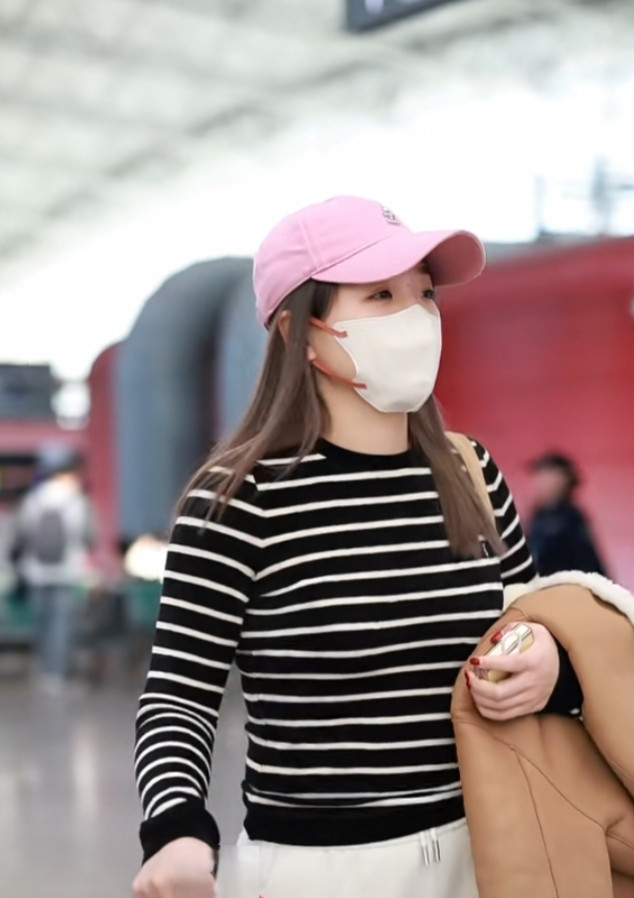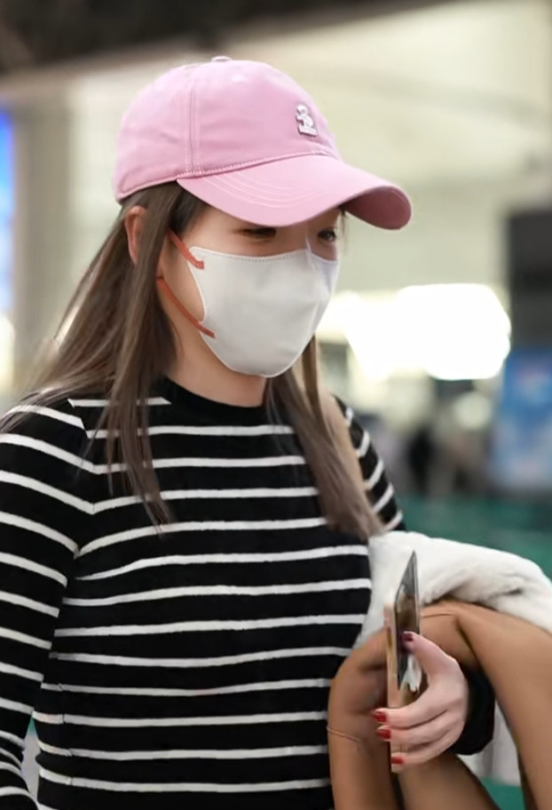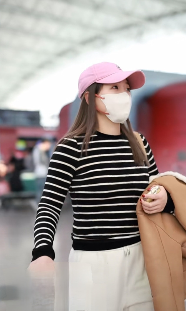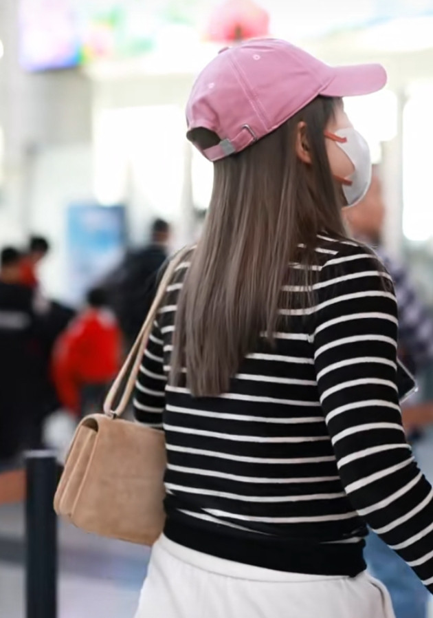 刘诗雯广州出发, 粉色棒球帽配条纹衫, 简约又高级