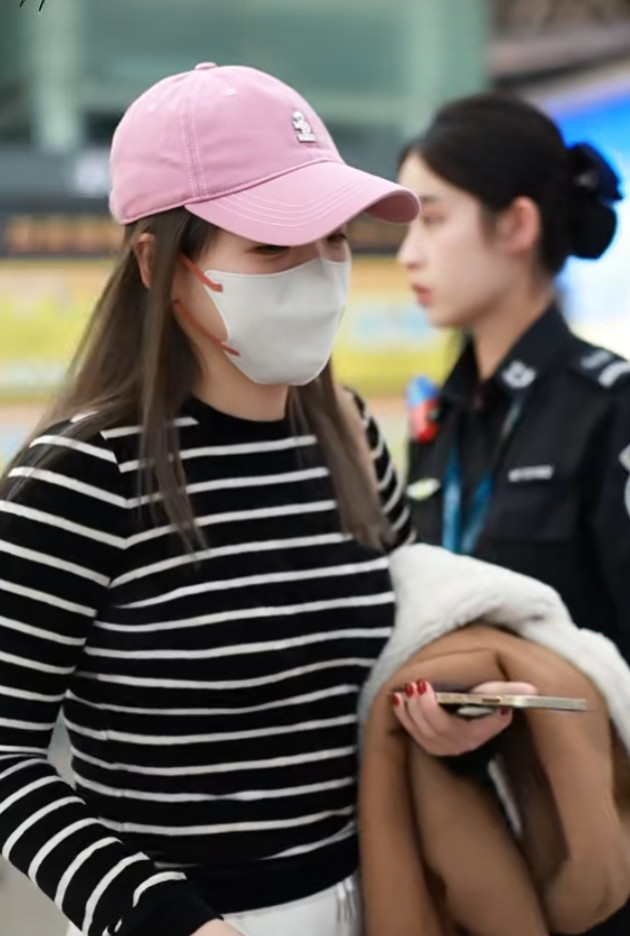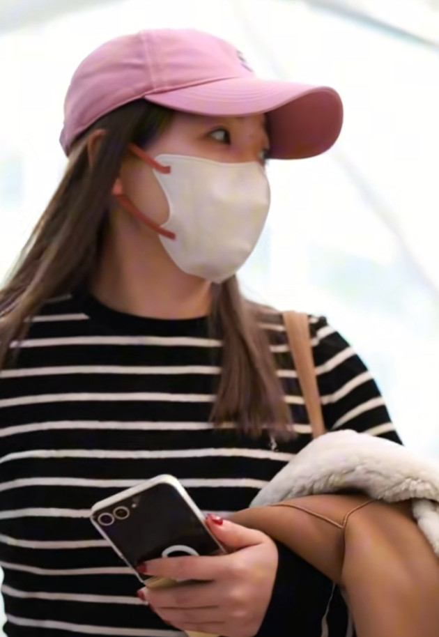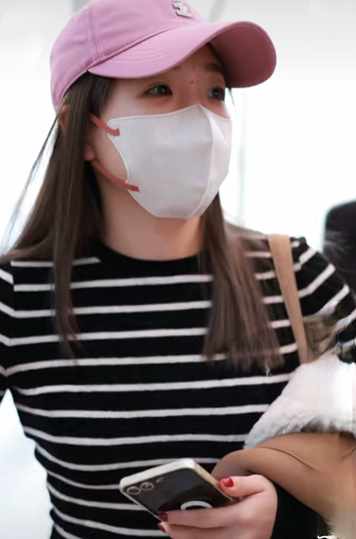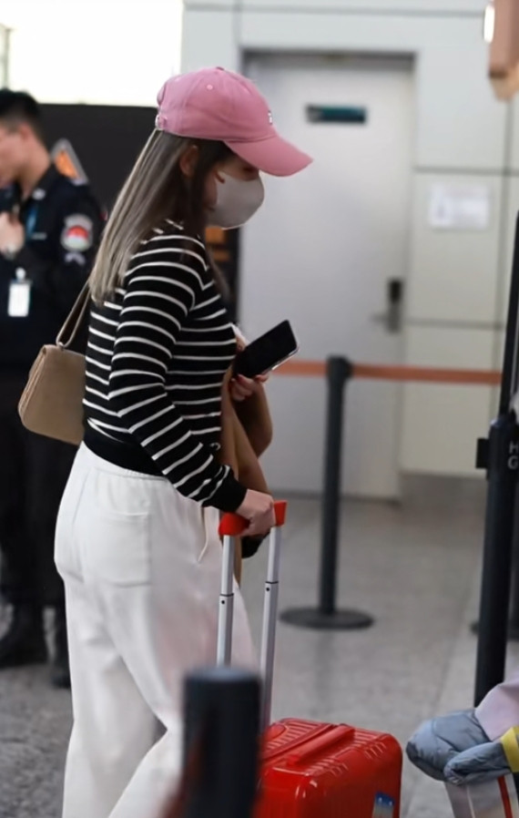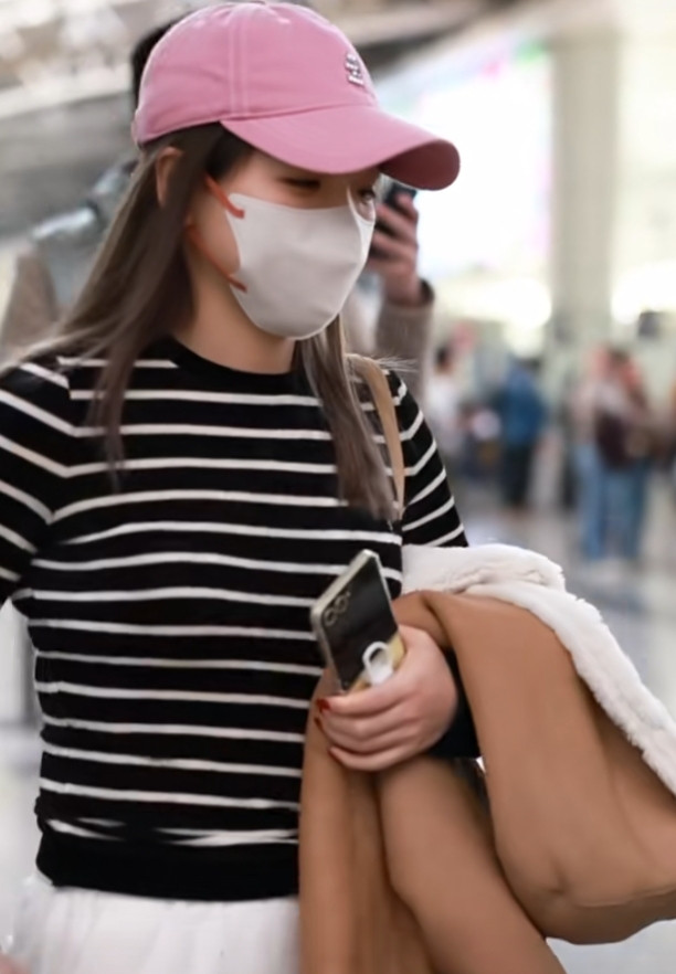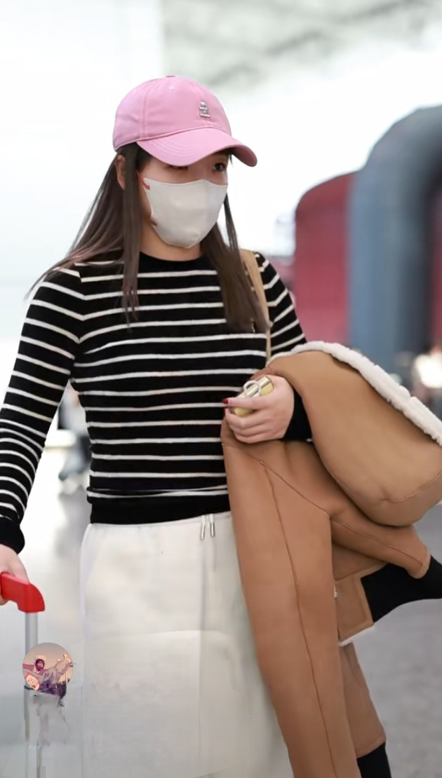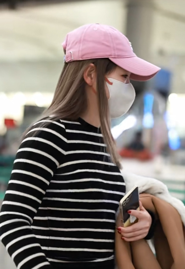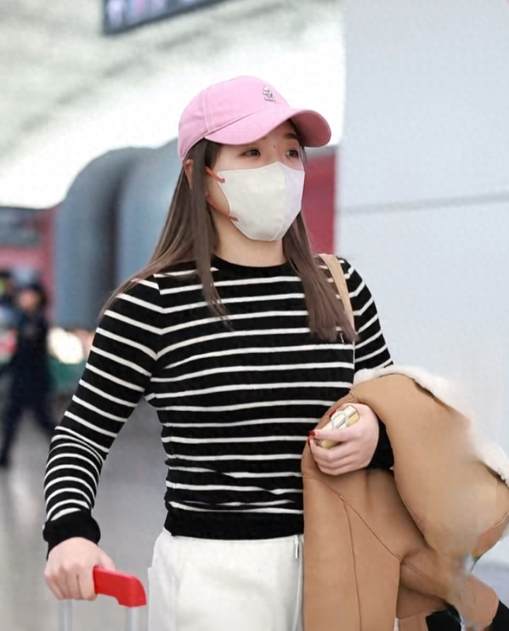 刘诗雯广州出发, 粉色棒球帽配条纹衫, 简约又高级