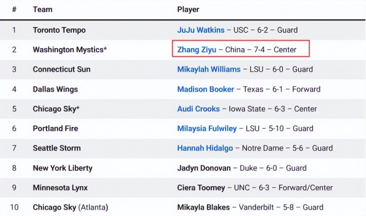 中国巨人! 张子宇2027年将获WNBA选秀资格 知名网站预测成榜眼