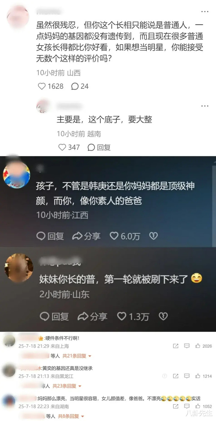 因此,网友们对于黄芊玲是否要出道这个问题是有明确答案的,有的评价她没遗传到黄奕的美貌基因,也有人劝她要先看看自己能不能承受大家现阶段对她外貌的评价。这些话虽然不悦耳,却很真诚。