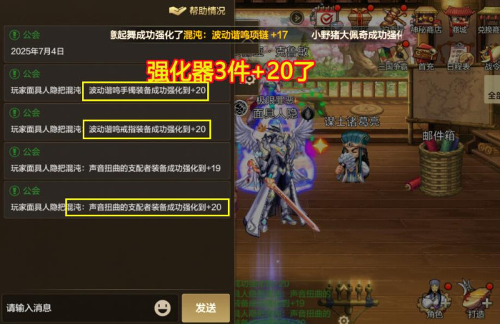 因为有勇士发帖扬言送的“强化器”有bug,几率很高!仅用20个强化器就成功强化了3件+20装备。