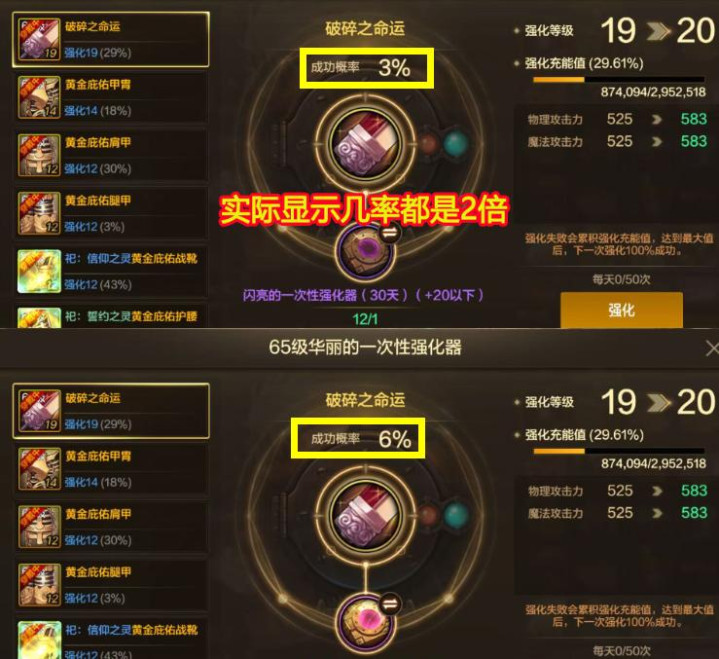 而实际显示的强化几率也是如此,就用+19装备来举例,闪亮强化器的成功率显示是3%,而发布会送的华丽强化器翻倍了,高达6%。