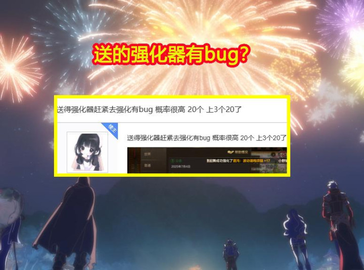 虽然说70级确定出增幅了!但强化+20依旧普通玩家的主旋律,因为拥有4个打团号,一般也就1~2个号能做到全身+20,所以官方在发布会上送6张高等级强化券确实挺香的,但没想到众多奖励中的“20个强化器”却让玩家们吵起来了!