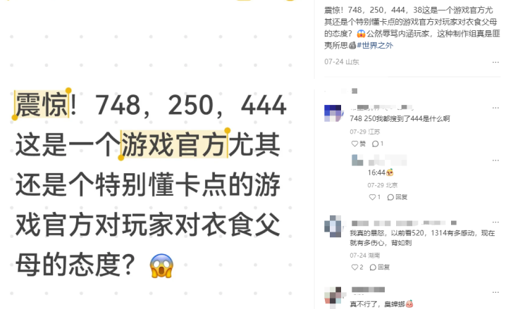甚至对比此前卡点“1314”、“520”发布活动福利的细腻操作,该官方应对此次危机时,以“444”“748”“250”等卡点反讽玩家的操作,还对其核心用户造成了的极大情感忽视与伤害,仿佛在宣告:“你们的感受并不重要,我们只关心利润。”