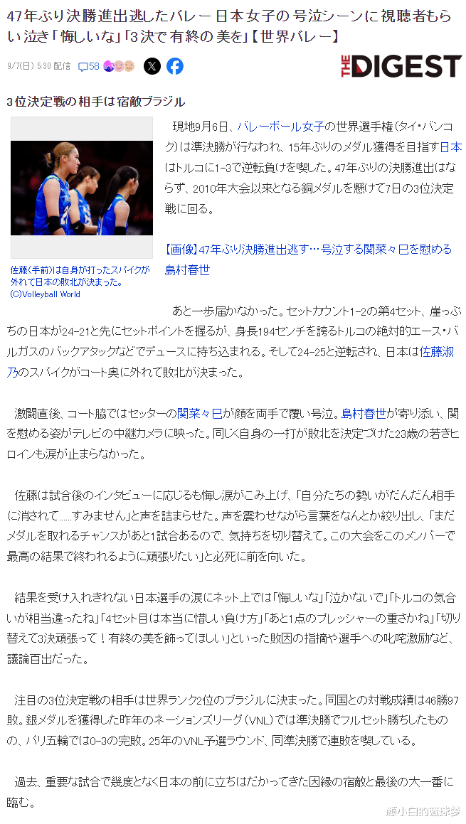 日媒《DigEst》也发文谈到日本女排本次世锦赛的征程,文中写道很多日本球迷都在为这支年轻的日本女排加油,日本女排有机会拿到自2010年世锦赛后又一枚铜牌。