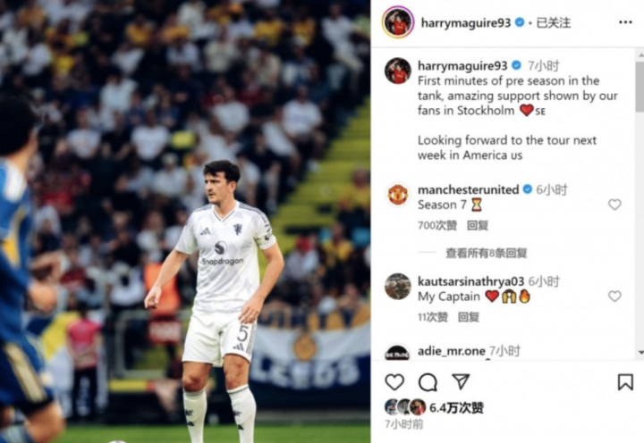 比赛进行到下半场,曼联主帅滕哈格对阵容进行大幅度轮换,马奎尔披挂上阵,戴上队长袖标,与队友们一同捍卫红魔防线。在场上,马奎尔展现出了扎实的防守功底,多次成功解围,传球成功率颇高。不过,第 74 分钟时,滕哈格做出换人调整,马奎尔被年轻球员泰勒・弗雷德里克森换下。据《电讯报》记者詹姆斯・达克透露,此次短时间出场是球队提前既定的安排,并非马奎尔受伤。赛后,马奎尔在个人社交媒体上分享了比赛照片,并激动地写道:“季前赛首次出场,斯德哥尔摩的曼联球迷们给予了我无与伦比的支持,那种氛围实在令人惊叹。同时,我满心期待着下周开启的美国巡回赛,渴望在那里继续为球队贡献力量。” 此前,马奎尔在曼联的处境一度艰难,队长职务被剥夺,但他凭借自身努力,重新赢得了教练与球迷的信任。此次季前赛首秀,无疑是他新征程的良好开端,球迷们也期待他在美国行中能有更精彩表现,助力曼联在新赛季取得佳绩 。