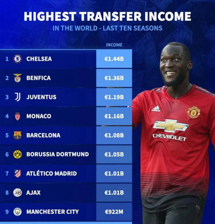 近十年欧洲各大俱乐部卖人收入排行榜, 切尔西高居榜首